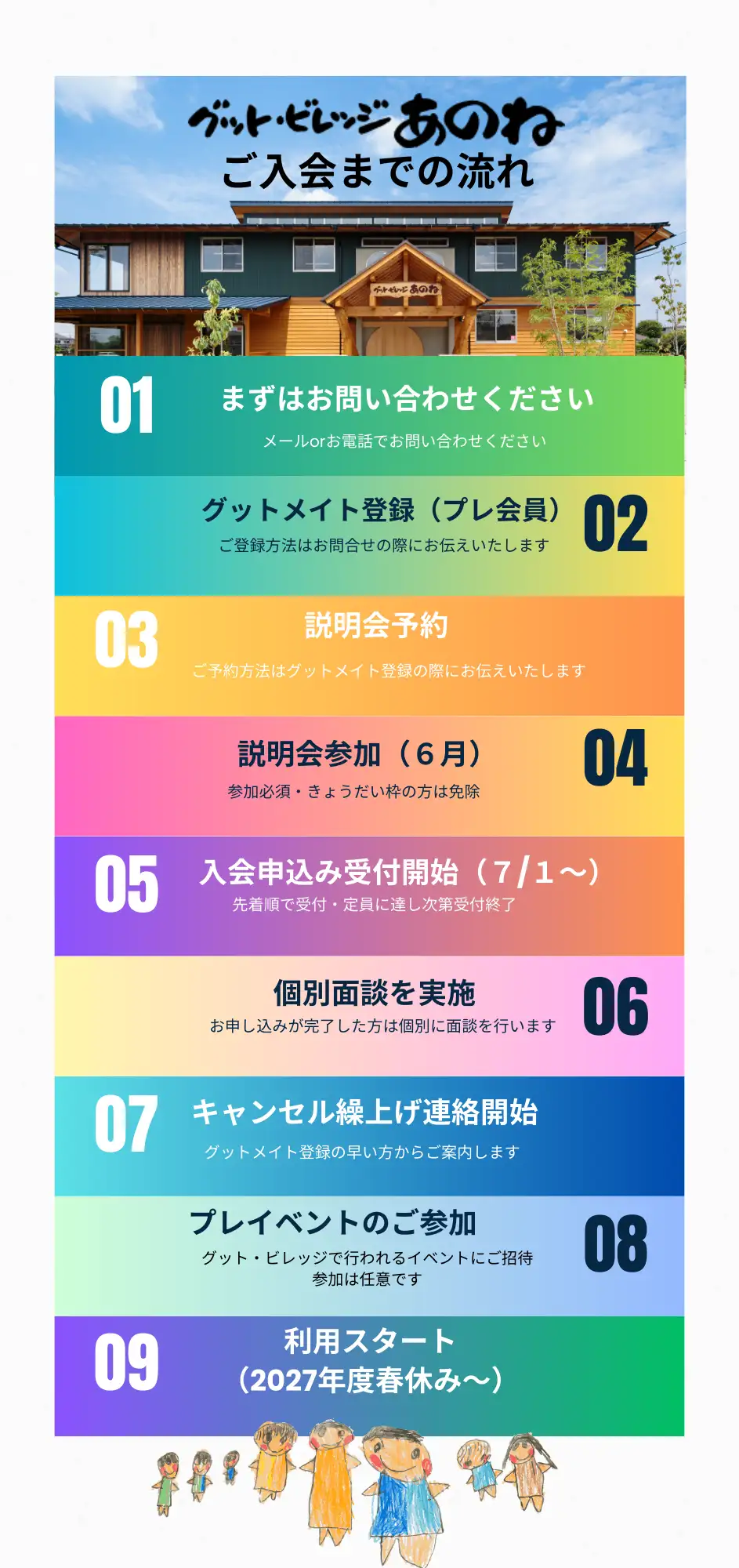 現在、令和8年度の利用枠は満員となっており、途中退会が発生した人数分のみ随時募集をいたします。